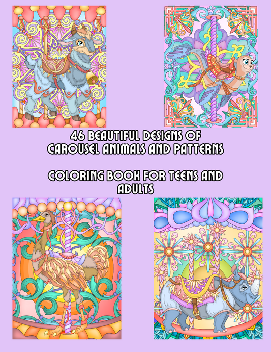 Carousel Animals Coloring Book | 46 Beautiful Fantasy Pages of Intricate Patterns and Animals for Teens and Adults | Instant PDF Download
